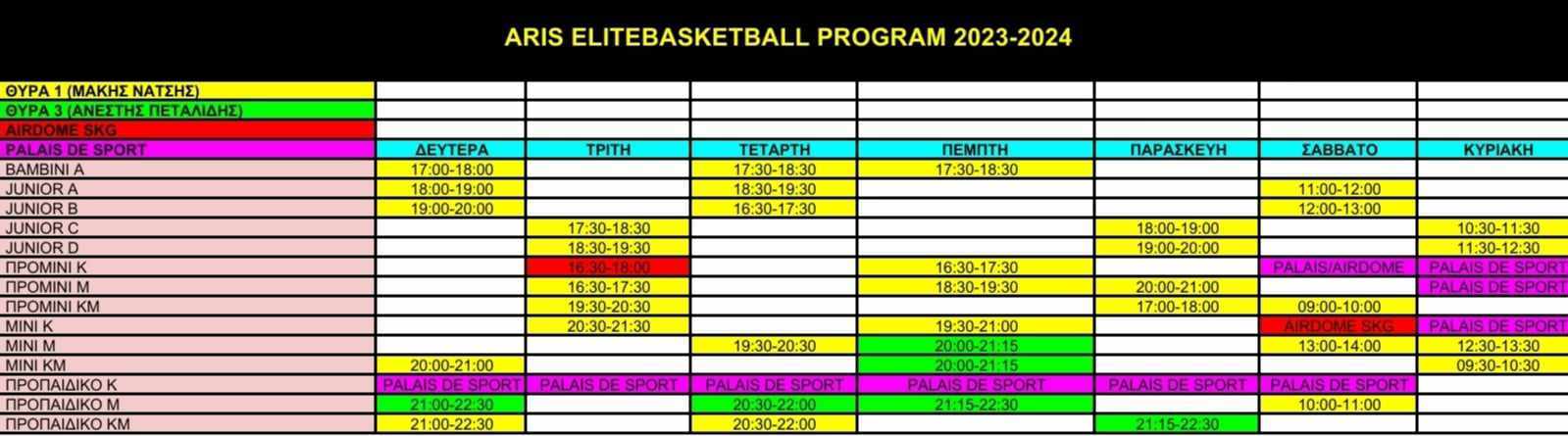 Το πρόγραμμα των προπονήσεων είναι αναρτημένο και διαθέσιμο στον παρακάτω σύνδεσμο. Ταυτόχρονα, επιθυμούμε να ενημερώσουμε ότι οι εγγραφές στο ARIS Elite Basketball Program συνεχίζονται! Εάν ενδιαφέρεστε, μπορείτε να επικοινωνήσετε απευθείας με τη γραμματεία της Ακαδημίας στο τηλ. +30 6971568478.