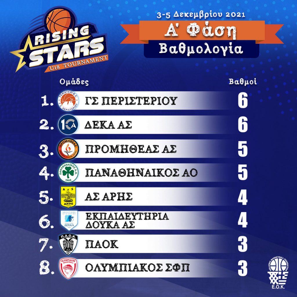 «Το τουρνουά U18 Rising Stars, το οποίο έδωσε βήμα και αγωνιστική δράση στα νέα παιδιά σε μια δύσκολη εποχή εξαιτίας του κορονοϊού επιστρέφει για τη Β’ Φάση το Σαββατοκύριακο 22 και 23 Ιανουαρίου. Οι αγώνες θα διεξαχθούν στην Αθήνα και στη Θεσσαλονίκη και θα αγωνιστούν οι ΠΑΟΚ, Παναθηναϊκός, ΔΕΚΑ, Περιστέρι, Ολυμπιακός. Προμηθέας Πάτρας, Δούκας και Άρης.