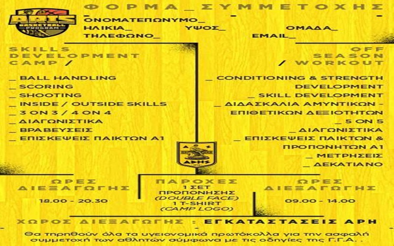 Ο Α.Σ ΑΡΗΣ και το Aris Elite Basketball Program ανακοινώνουν τη διεξαγωγή προπονητικού camp δύο περιόδων (7/6-25/6 και 5/7-23/7) για αθλητές ηλικίας 9-18 ετών (γεννημένοι 2004-2011), στις αθλητικές εγκαταστάσεις του ΑΡΗ.