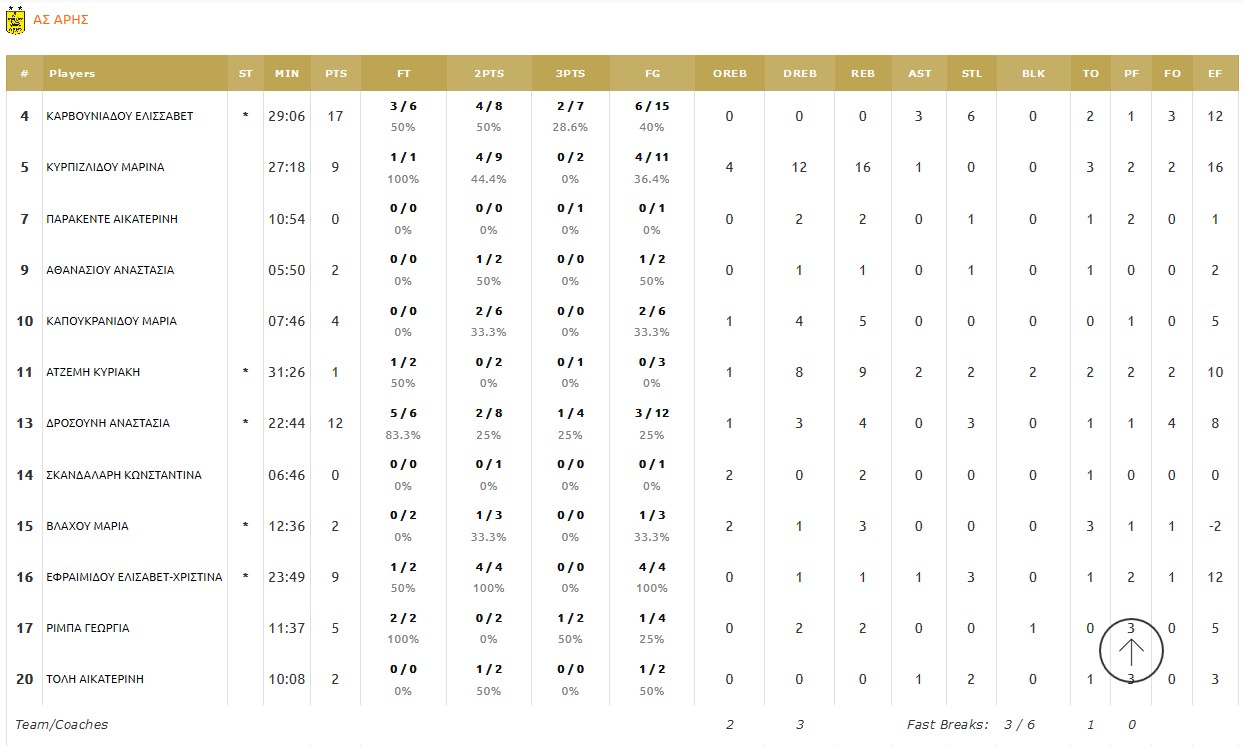 ΑΡΗΣ (Τσαμπούρη): Καρβουνιάδου 17(2), Κυρπιζλίδου 9(16 ρ.), Παρακέντε, Αθανασίου 2, Καπουκρανίδου 4, Ατζέμη 1, Δροσούνη 12(1), Σκανδαλάρη, Βλάχου 2, Εφραιμίδου 9, Ρίμπα 5(1), Τόλη 2.