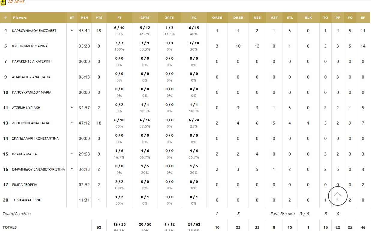 ΑΡΗΣ (Τσαμπούρη): Καρβουνιάδου 19(1), Κυρπιζλίδου 9(1), Αθανασίου, Ατζέμη 2, Δροσούνη 18, Βλάχου 9, Εφραιμίδου 2, Ρίμπα 2, Τόλη 1