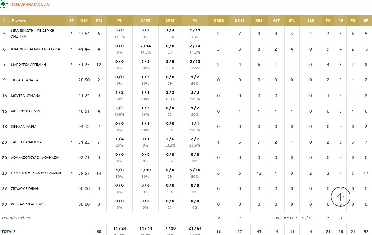 Παναθηναϊκός (Κατσαρέλιας): Μπλιθικιώτη 6(1), Ιωάννου 6, Μαρούγκα 12(2), Τίγκα 2, Μούτσα 9(2), Μόσχου 2, Κεφαλά 2, Ζάρρη 7(2), Αθανασοπούλου, Παναγιωτοπούλου 14.