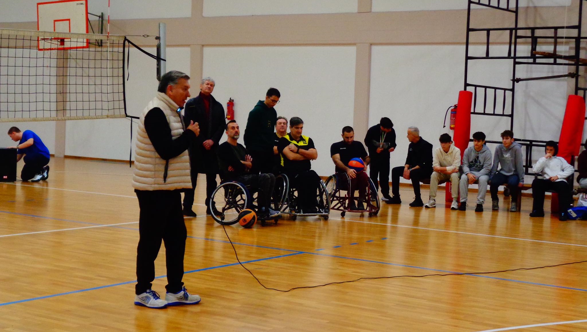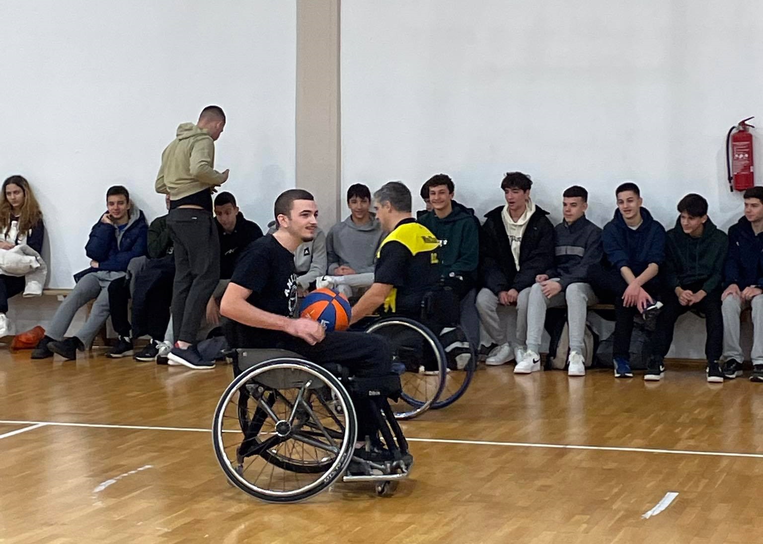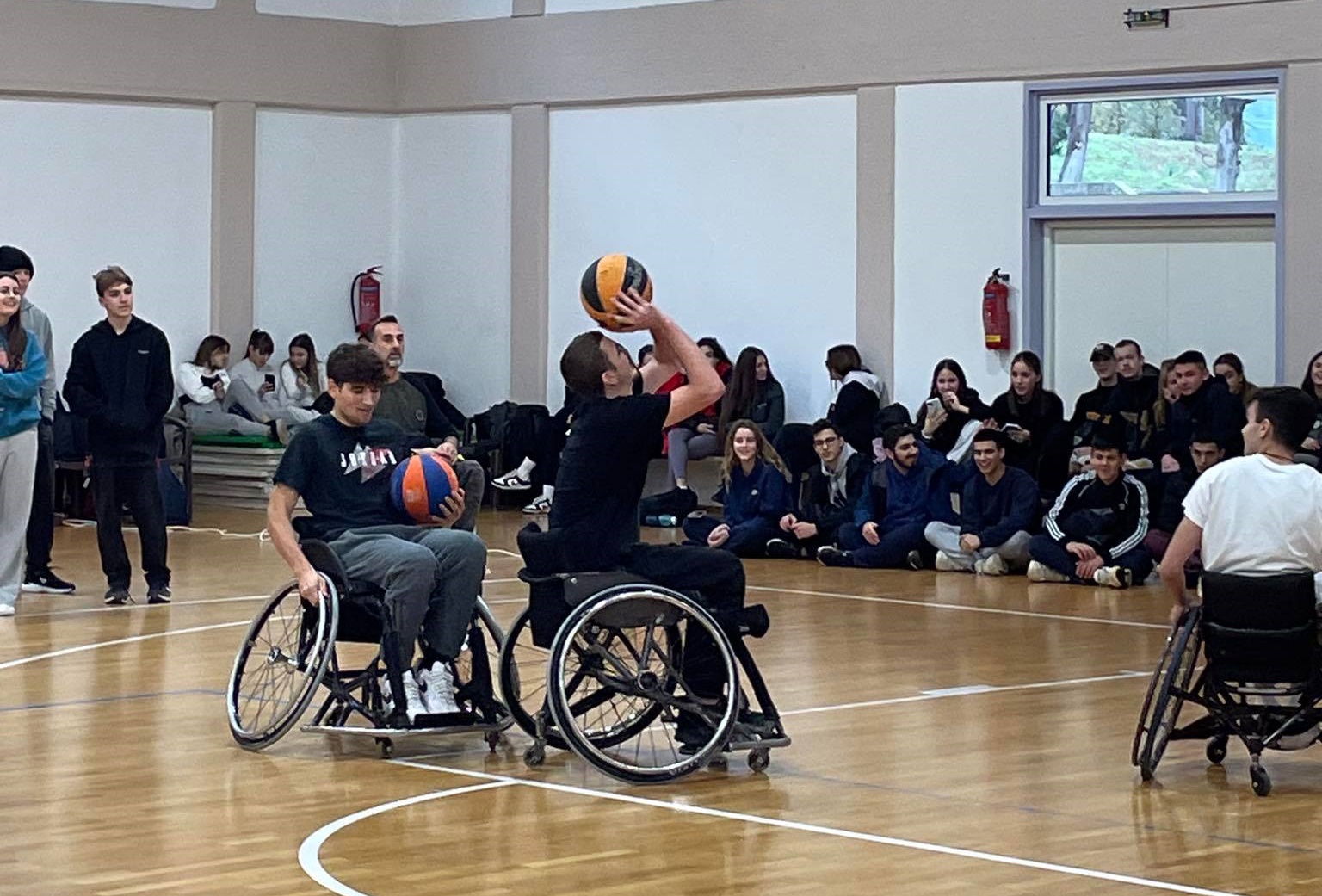 Ακολούθησε επίδειξη του αθλήματος Μπάσκετ με Αγωνιστικό Αμαξιδίων , όπου ανταλλάξαμε απόψεις , λύσαμε απορίες και οι παρευρισκόμενοι δοκίμασαν να αθληθούν με Αγωνιστικά Αμαξίδια. Ο ενθουσιασμός ήταν διάχυτος, τόσο από τους μαθητές, όσο και από τους καθηγητές.