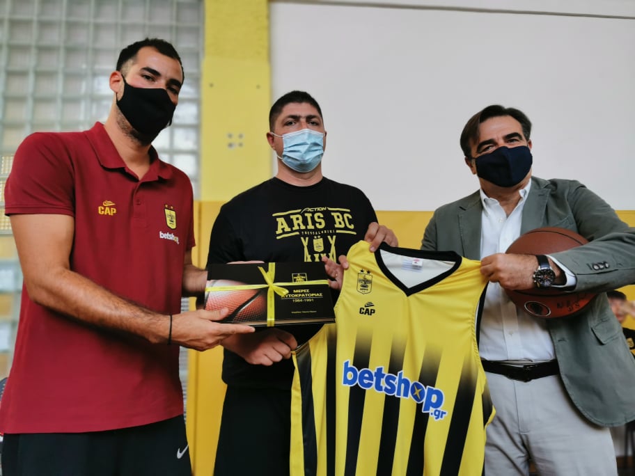 Ο κ. Αρβανίτης και τα στελέχη του ARIS Basketball Program (Αντώνης Ασημακόπουλος, Γιάννης Κουσούλης, Δημήτρης Μήτσικας, Κωνσταντίος Χατζής) έδωσαν στον κ. Σχοινά ένα βιβλίο της ιστορίας του ΑΡΗ, μία φανέλα της ομάδας μπάσκετ και μία μπάλα υπογεγραμμένη από τους καλαθοσφαιριστές και το προπονητικό επιτελείο της ανδρικής ομάδας μπάσκετ του συλλόγου.
