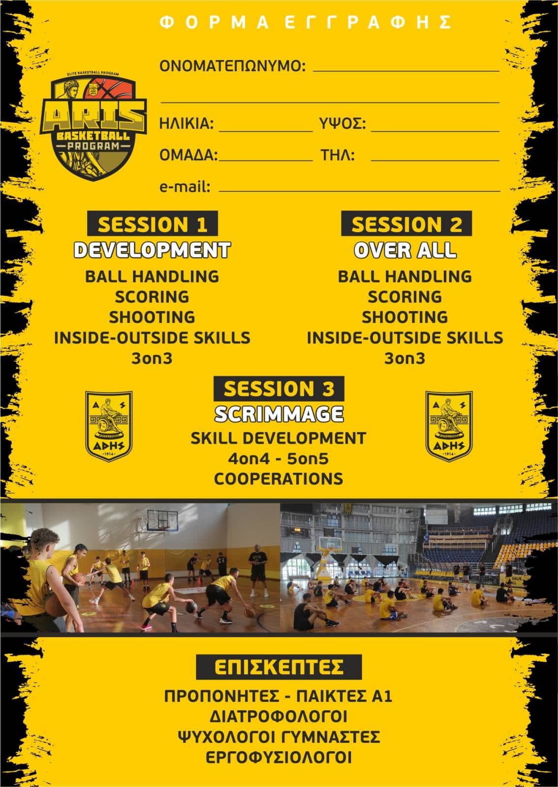 Η υψηλή ειδίκευση των έμπειρων προπονητών μας (Αντώνης Ασημακόπουλος, Δημήτρης Μήτσικας, Δημήτρης Παπαδόπουλος, Φοίβος Γυμνόπουλος), το πλάνο και οι σημαντικοί καλεσμένοι, προσφέρουν στους αθλητές την ευκαιρία να διευρύνουν τις προοπτικές τους και παράλληλα να ζήσουν μια ξεχωριστή εμπειρία. Οι σύγχρονες προπονητικές μέθοδοι που εφαρμόζει το ARIS ELITE BASKETBALL PROGRAM καλύπτει όλο το φάσμα των ερεθισμάτων και των δεξιοτήτων που έχει ανάγκη ένας σύγχρονος αθλητής, με σύγχρονα προπονητικά μέσα και εγκαταστάσεις υψηλού επιπέδου («Nick Galis Hall», «Μάκης Νάτσης»).
