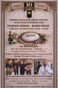 Το τμήμα Παραδοσιακών Χορών του Α.Σ. ΑΡΗΣ γιορτάζει 10 χρόνια ζωής και το γιορτάζει με τον χορό των Χορών! Το Σάββατο, 17 Ιανουαρίου, στις 20:00 στη Νεράιδα (17ο χλμ. Θεσσαλονίκης-Περαίας (φανάρι διασταύρωσης Αεροπορίας-Ν. Ρυσίου) πραγματοποιεί τον ετήσιο Χορό του και θα κόψει και την πρωτοχρονιάτικη βασιλόπιτα.