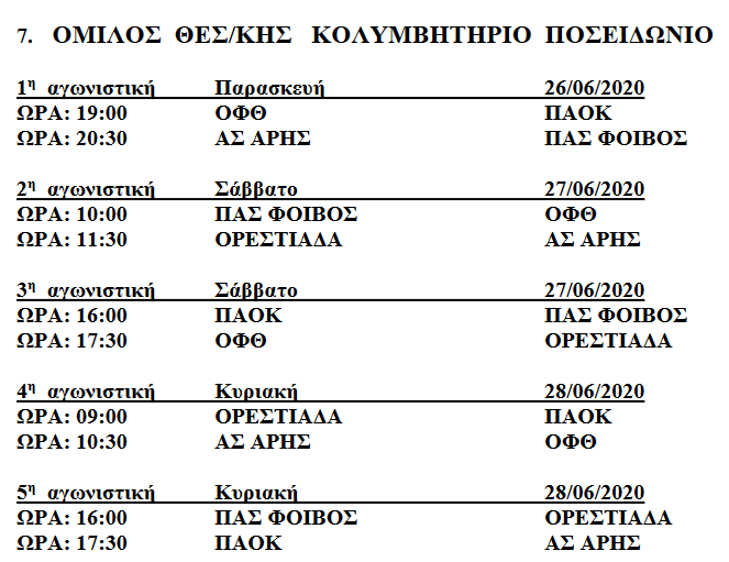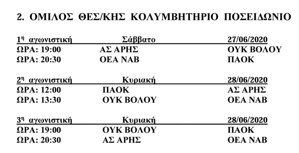 Κυριακή 28/6: ΑΡΗΣ – ΟΕΑ ΝΑΒ (20:30).