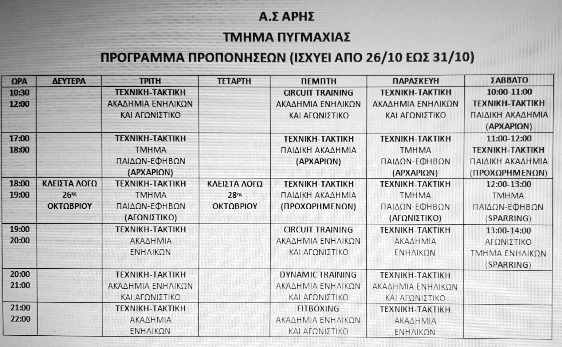 Το τμήμα πυγμαχίας του Α.Σ. ΑΡΗΣ, εναρμονισμένο με τα μέτρα για την αντιμετώπιση του κορωνοϊού, κατόπιν τοποθετήσεως του νομού Θεσσαλονίκης στο επίπεδο 3 αυξημένης επιτήρησης του χάρτη υγειονομικής ασφάλειας, ανακοινώνει το νέο πρόγραμμα προπονήσεων που θα ισχύει από 26/10 έως 31/10/2020.