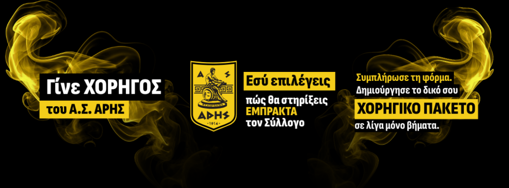 Ο Αθλητικός Σύλλογος ΑΡΗΣ συνεργάζεται με επιχειρήσεις που επιθυμούν να στηρίξουν τα αγωνιστικά τμήματα και τις δράσεις του συλλόγου, μέσα από  στοχευμένες και ουσιαστικές χορηγικές συνεργασίες.