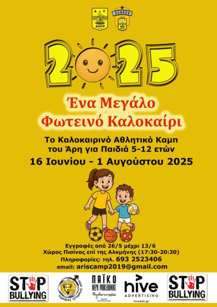 Το ARIS Summer Camp έρχεται και πάλι για να προσφέρει απίθανες στιγμές διασκέδασης στα παιδιά σας! Οι εγγραφές ξεκινάνε από σήμερα, Δευτέρα 26 Μαΐου 2025,