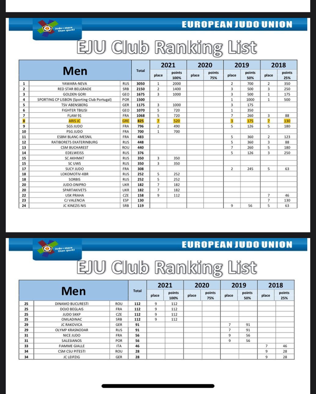 Οι «κιτρινόμαυροι» κατέλαβαν την όγδοη θέση στην ευρωπαϊκή κατάταξη της EJU Club Ranking List για τα έτη 2018-2019-2020-2021, ανάμεσα στις 34 καλύτερες ομάδες τις Ευρώπης.