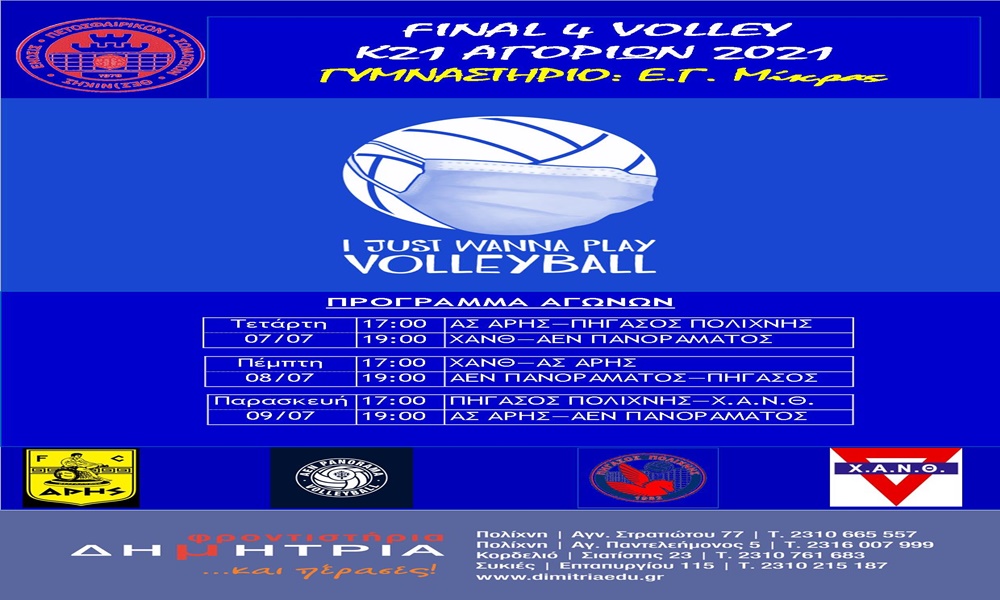 Η ομάδα Βόλεϊ Εφήβων του ΑΡΗ ρίχνεται την Τετάρτη 7/7 στη «μάχη» του φάιναλ φορ Κ21 της Ε.ΠΕ.Σ.Θ., με στόχο την πρόκριση στην τελική φάση του Πανελλήνιου Πρωταθλήματος και τον τίτλο του πρωταθλητή Θεσσαλονίκης.
