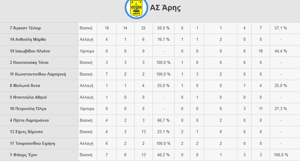 ΑΣ ΑΡΗΣ (Τσαϊρέλης): Άγκοστ 16 (14/25 επ., 1 άσσος, 1 μπλοκ, 57% υπ.), Κιουτσιούκη 3 (3/3 επ.), Κωνσταντινίδου 7 (2/2 επ., 3 άσσοι, 2 μπλοκ), Πήττα 4 (2/3 επ., 2 μπλοκ), Σίμιτς 4 (3/13 επ., 1 άσσος), Φάιερς 7 (6/13 επ., 1 μπλοκ) / Ιακωβίδου (λ, 44% υπ.), Μυλωνά 1 (1/4 επ., 25% υπ.), Νταντούλα 1 (1 άσσος), Τσομπανίδου 6 (2/2 επ., 2 άσσοι, 2 μπλοκ).
