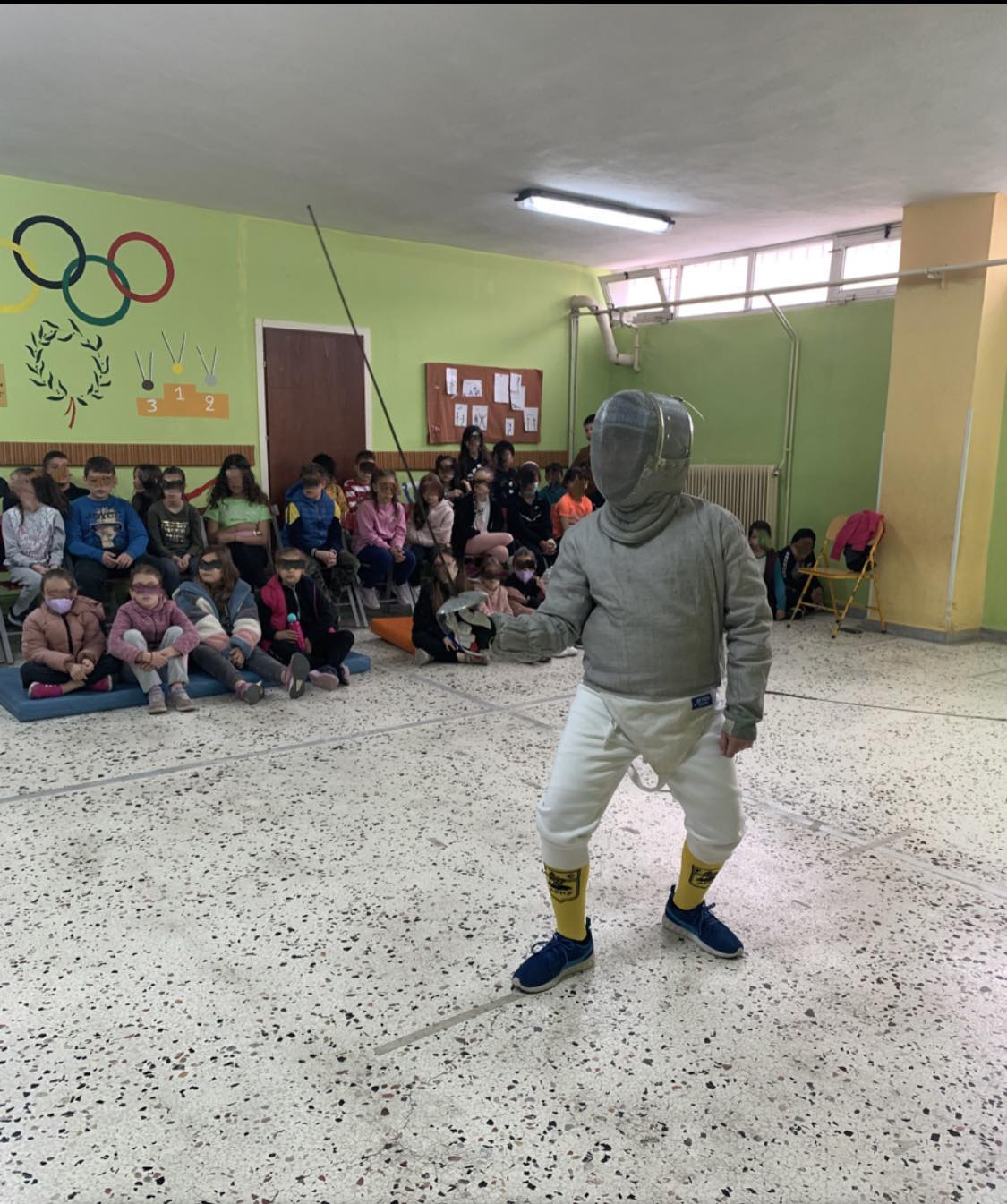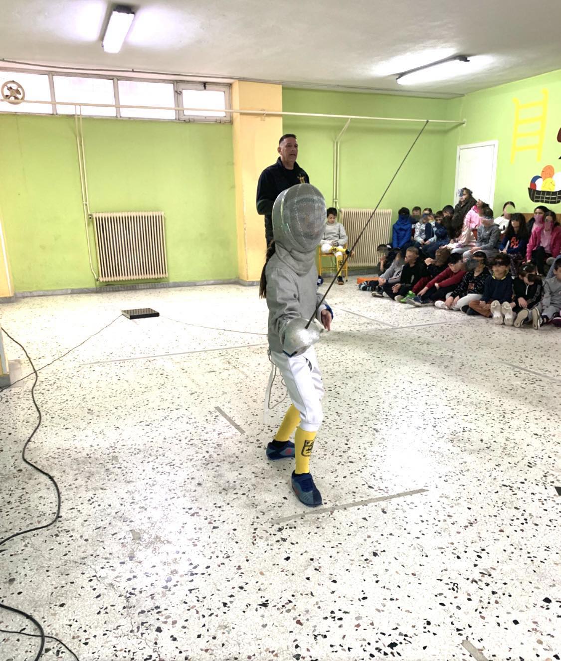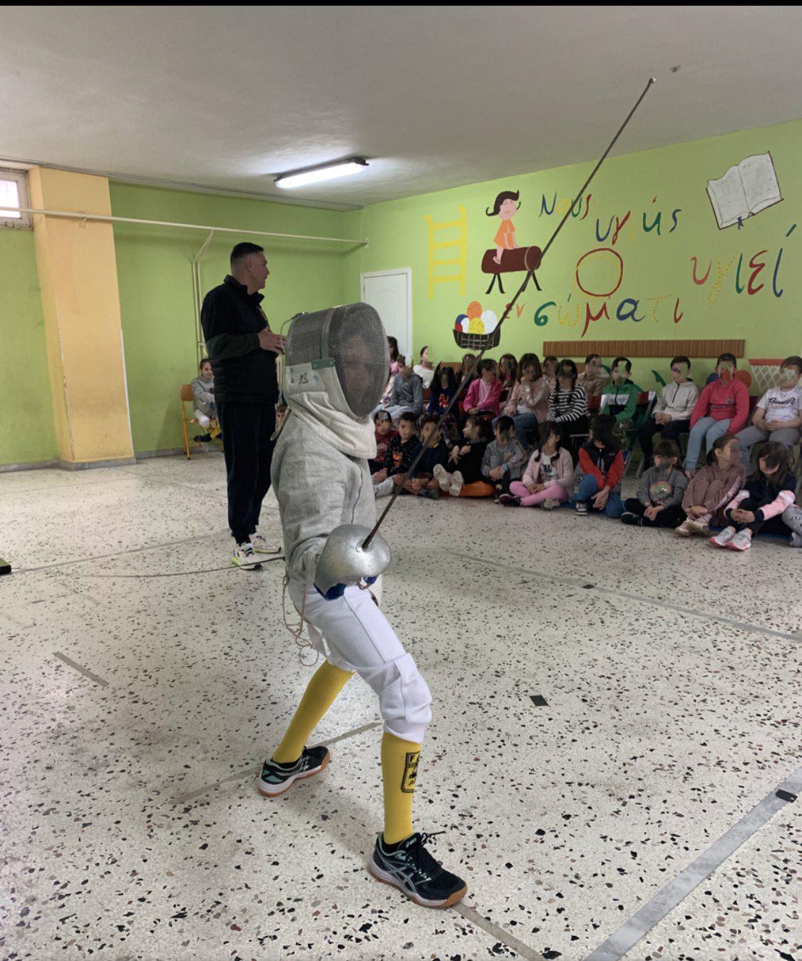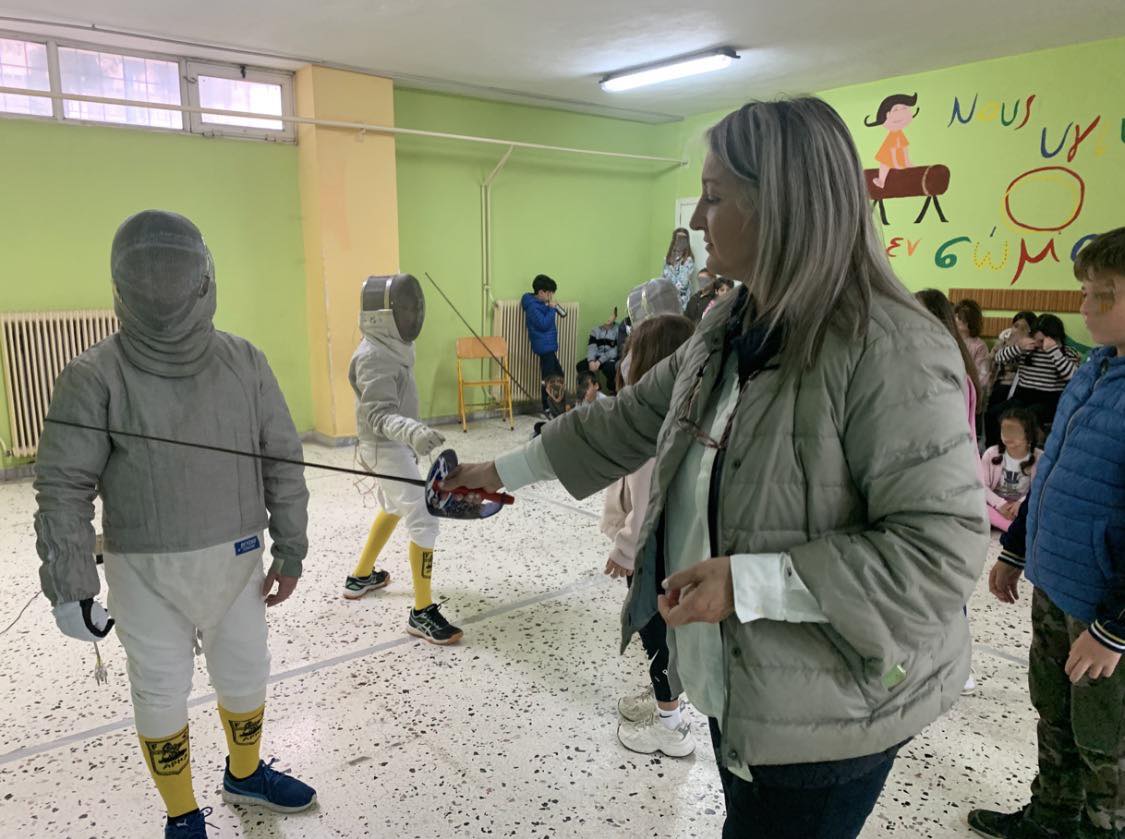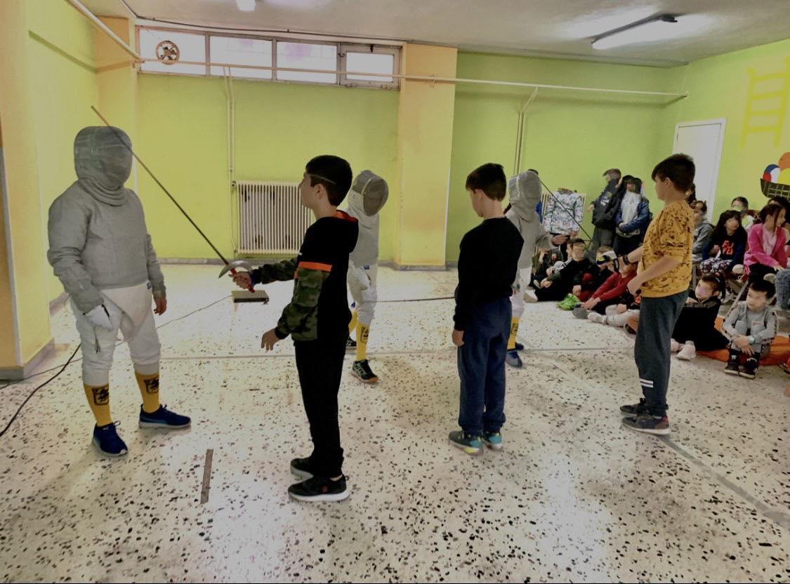 Η ομάδα μας παραβρέθηκε εκεί έπειτα από πρόσκληση της γυμνάστριας του σχολείου Μαρίας Καζάση προς την Ελληνική Ομοσπονδία Ξιφασκίας. Οι δάσκαλοι και οι μαθητές υποδέχτηκαν με ενθουσιασμό τους μικρούς μας αθλητές και παρακολούθησαν με μεγάλη προσοχή την επίδειξη ξιφασκίας. Στο τέλος απαντήθηκαν όλες οι απορίες των μαθητών και τους δόθηκε η ευκαιρία να πιάσουν το ξίφος και να έρθουν σε πρώτη επαφή με το άθλημα.